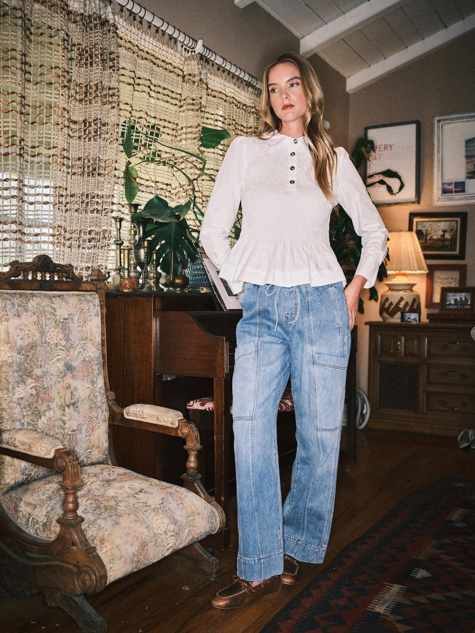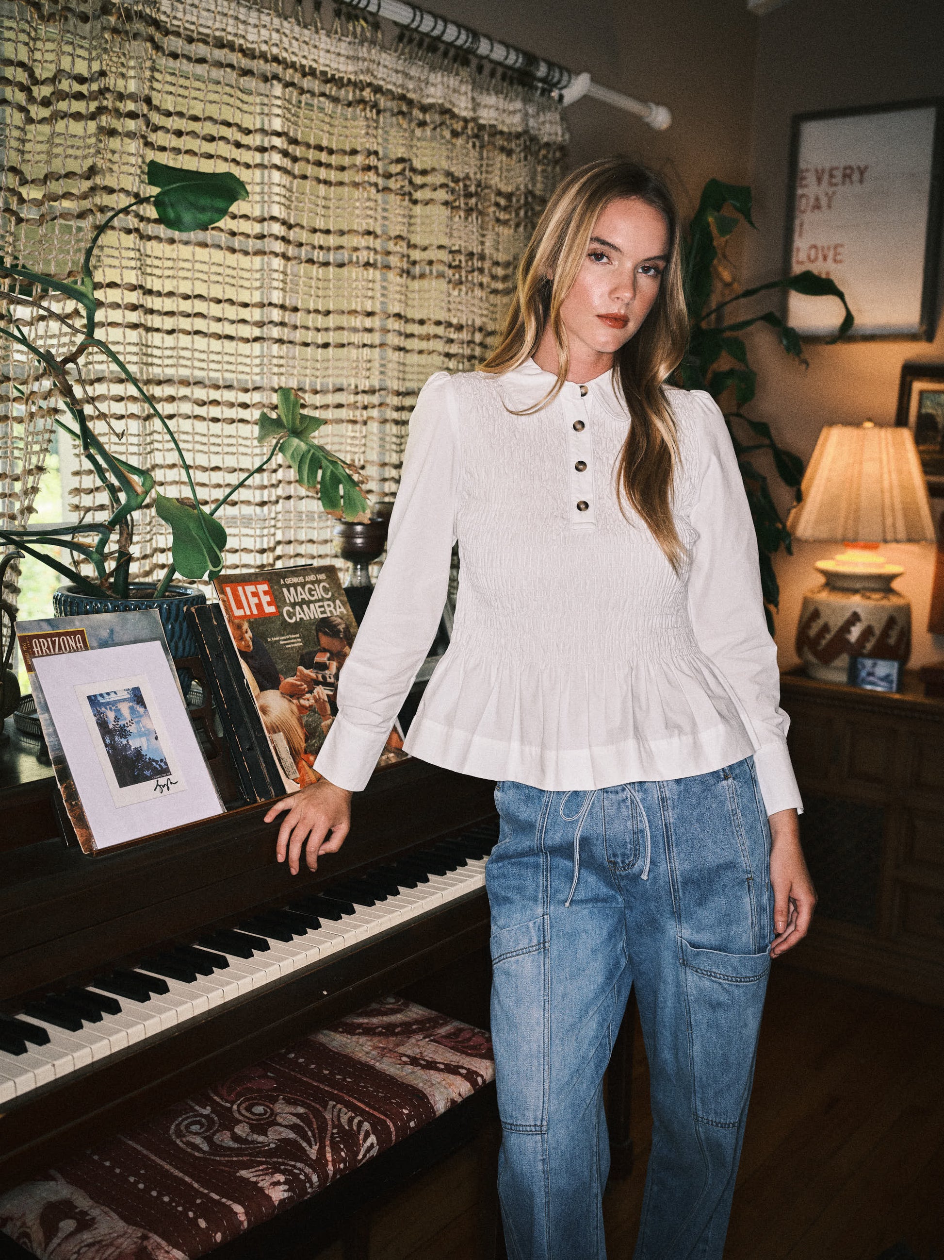 Discover effortless elegance with the Lisa Peplum Top, where delicate smocking and thoughtful design create an undeniably flattering look. The charming Peter Pan collar and classic button-down front add vintage-inspired appeal, while the expertly smocked bodice gently cinches at the waist before flowing into a graceful peplum hem. This piece celebrates your silhouette with textured sophistication, delivering the perfect balance of structure and movement for any occasion.-