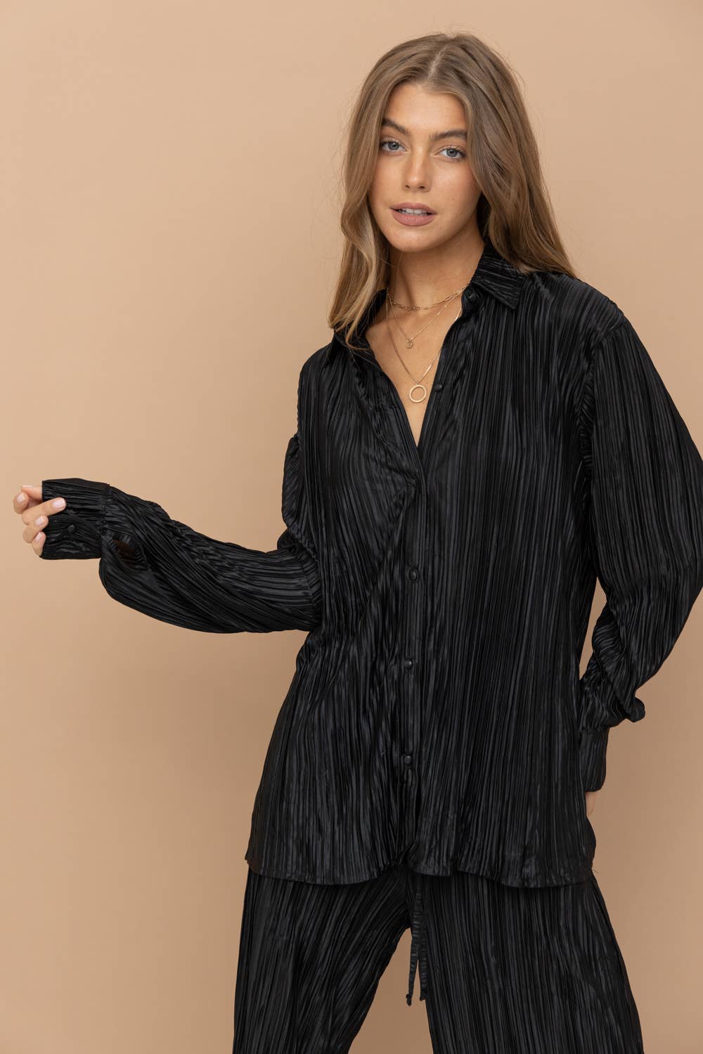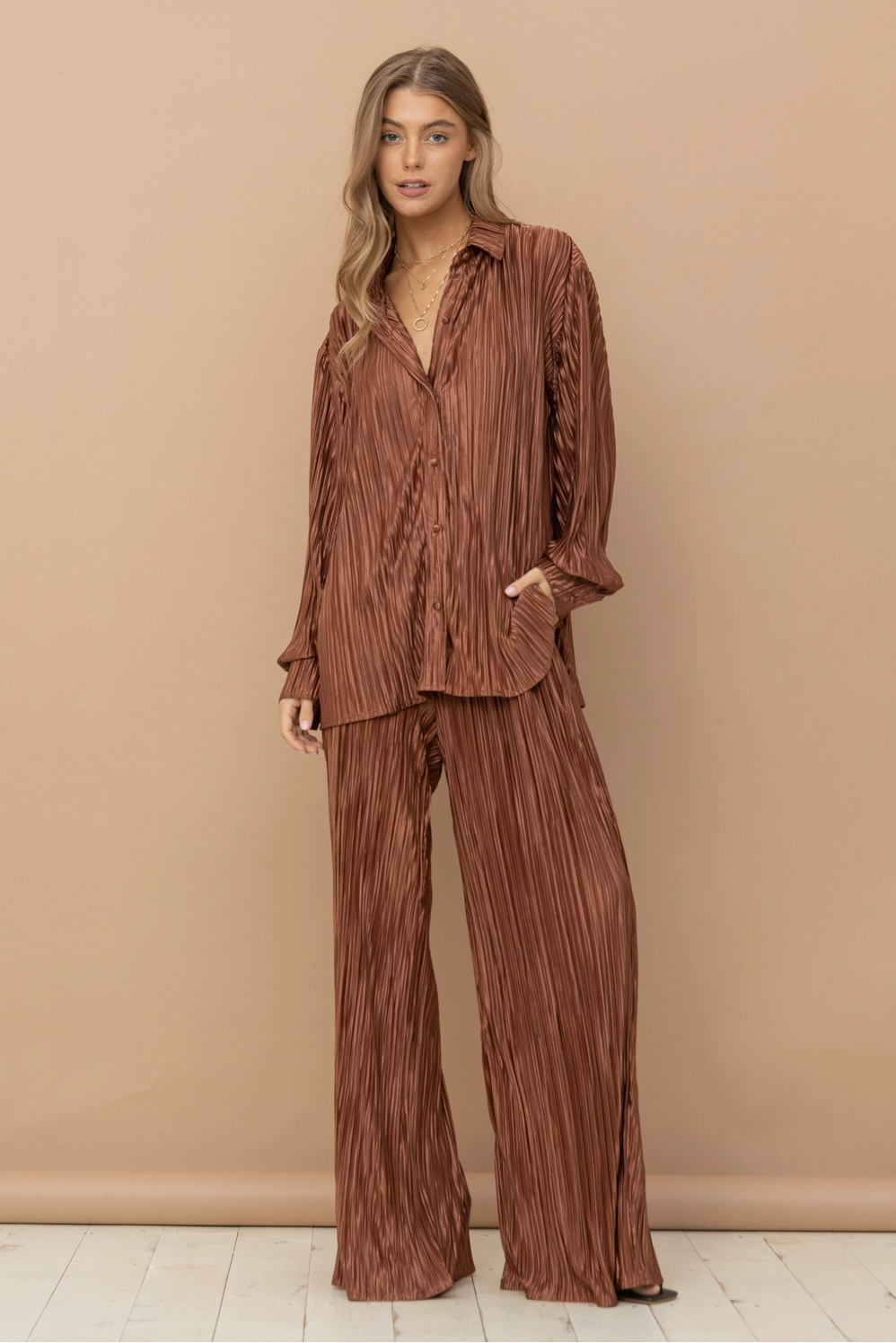 Indulge in the luxurious comfort of our Aleah Set, a true embodiment of elevated loungewear. The accordion mini pleat covered button up blouse is a standout feature of this set. The pleated detailing adds a touch of sophistication, while the sleek covered buttons lend an elegant and timeless appeal. Paired with it are the long pant lounge bottoms, designed for your utmost comfort. The relaxed fit allows for ease of movement. Whether you're lounging at home or stepping out, the Aleah Set exudes effortless grace and comfort!