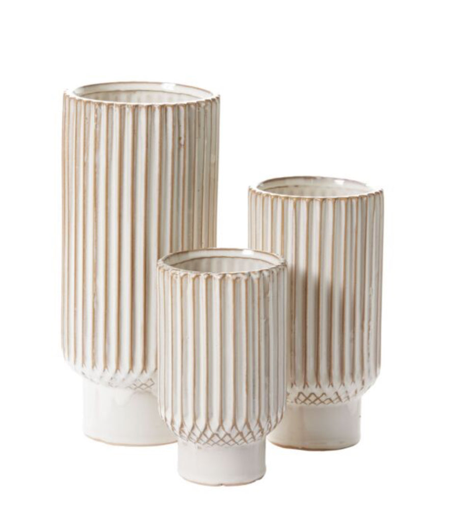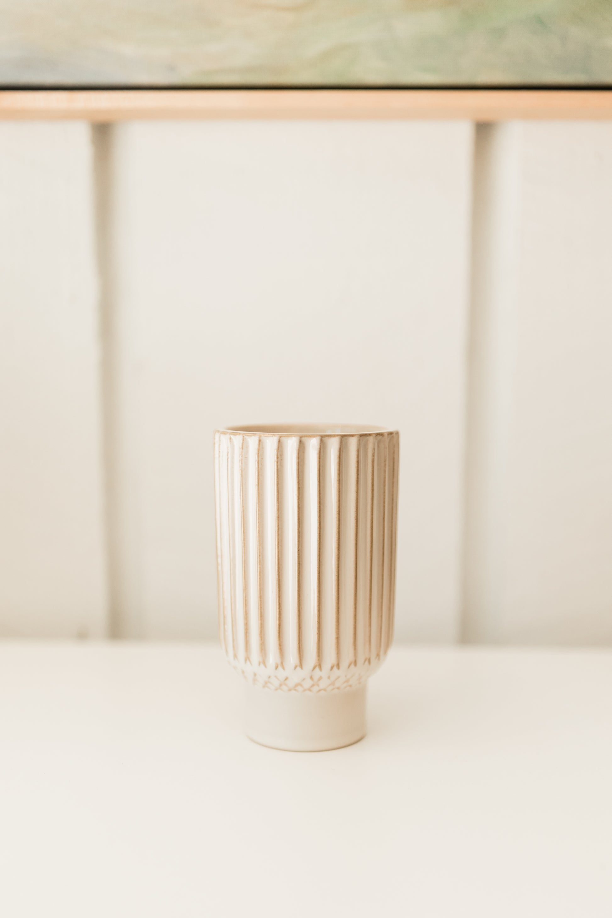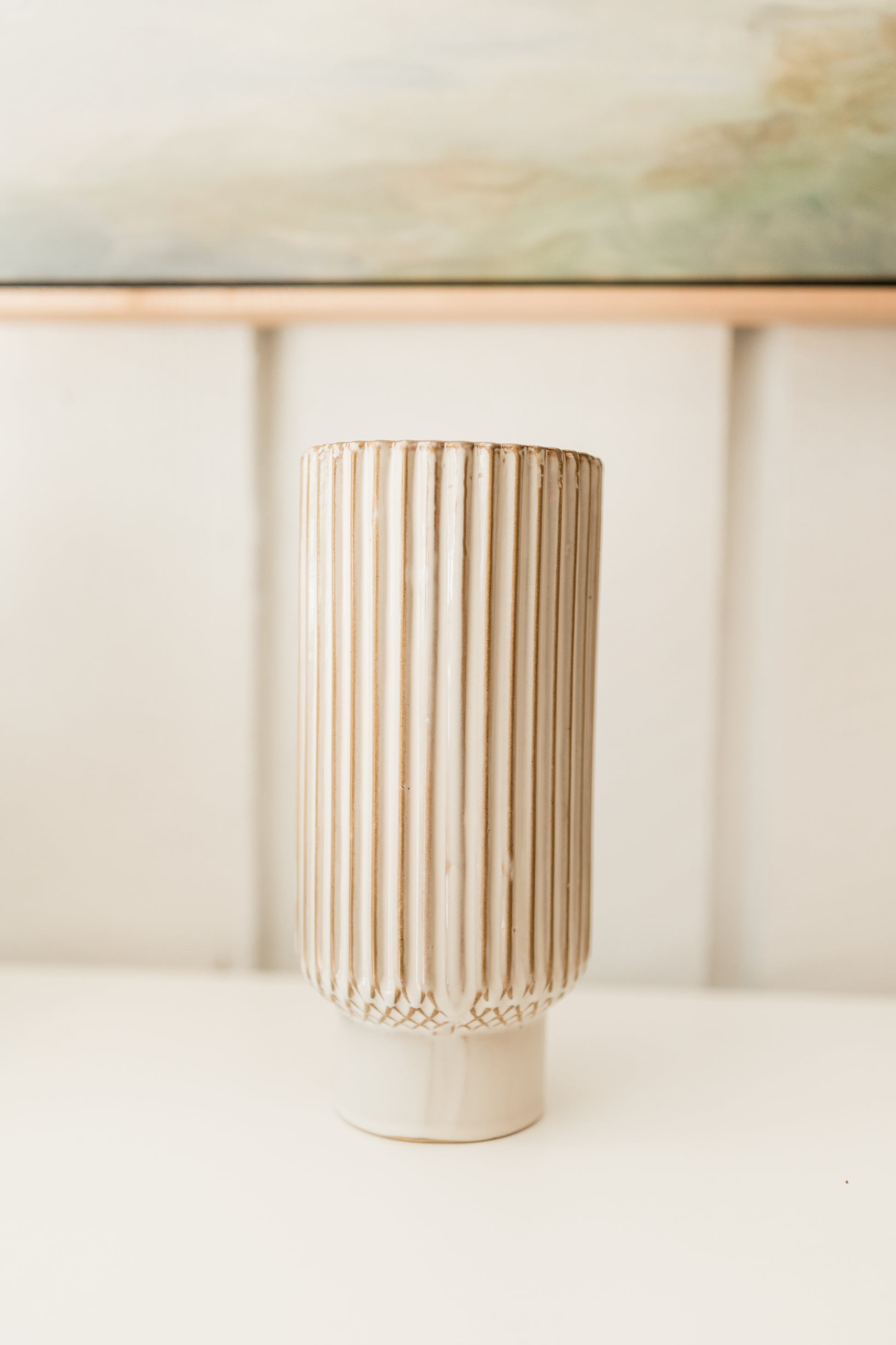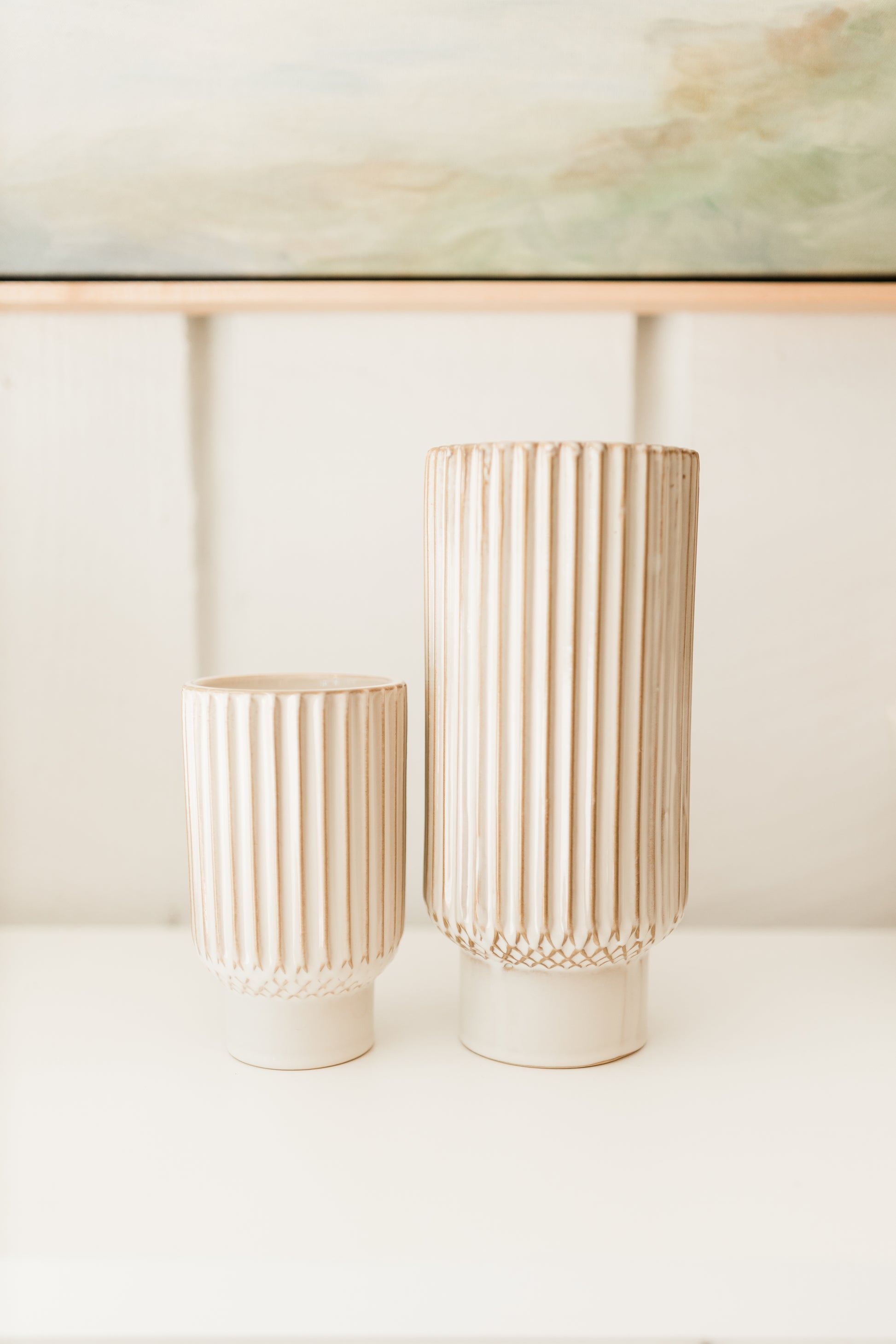 With its textured pattern and smooth base, the Astor Vase is a stunner in ivory. Elevate your plants and arrangements with this elegant everyday vase that adds tons of personality with its unique ridged finish.