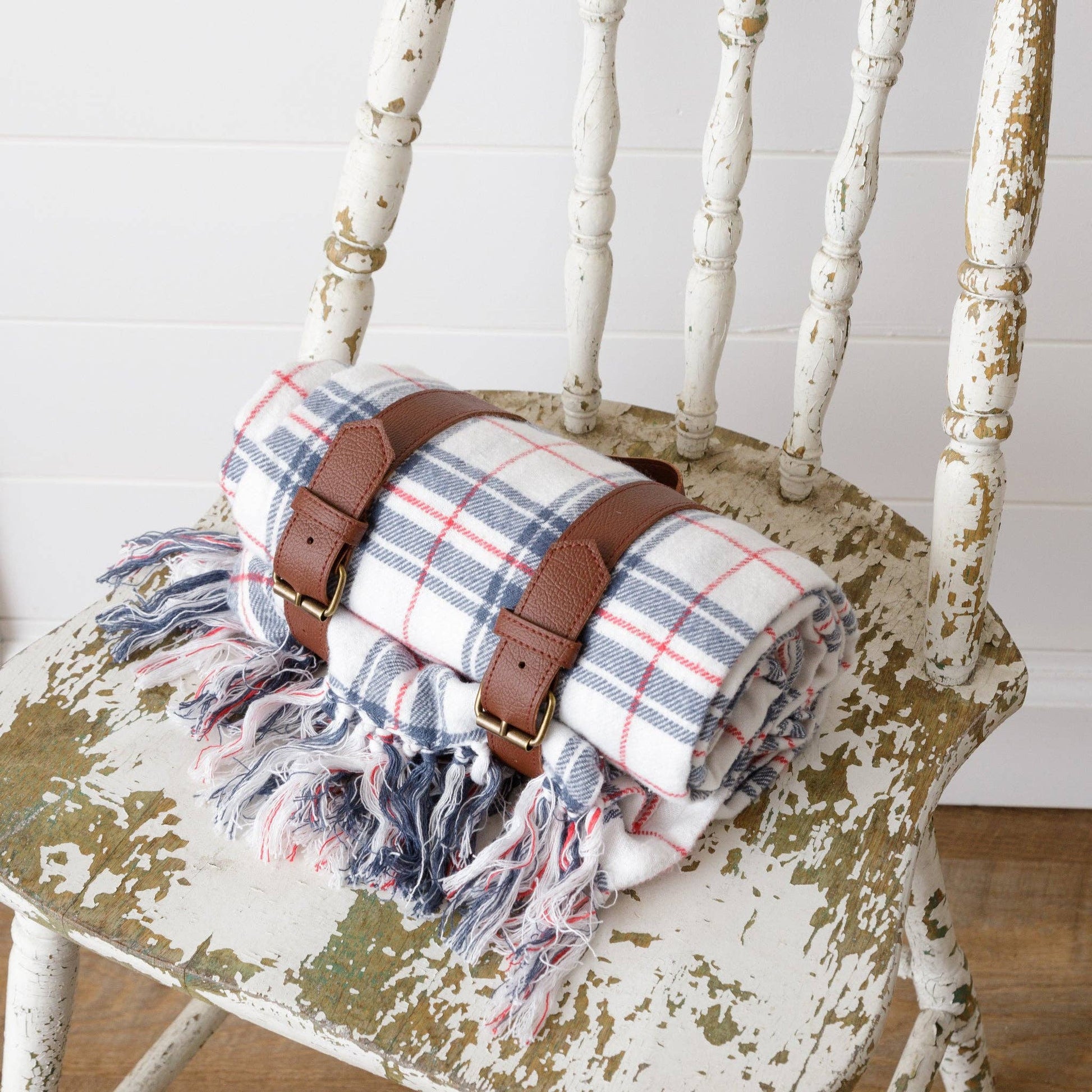 Experience the coziness and luxury of our Carry Along Throw in Red, White, and Blue Plaid. Crafted with premium cotton and leather, this 62" H x 50" W throw is the perfect companion for all your outdoor journeys. Don't forget to bring it along on your next adventure!