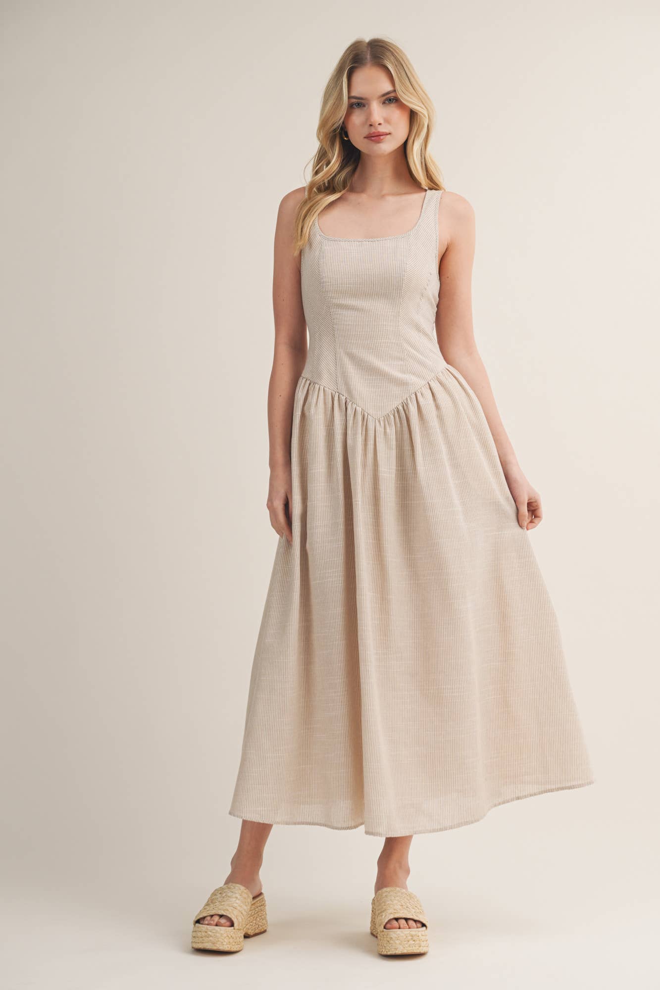 The Evelyn Dress combines timeless elegance with modern silhouette. Featuring a structured corset bodice and graceful drop waist, this striped design creates a refined, elongated line that flatters every figure. The classic stripe pattern adds visual interest while maintaining an effortlessly chic aesthetic. Perfect for elevating your everyday style or making a sophisticated statement at special occasions, this dress delivers both comfort and confidence in one stunning piece.