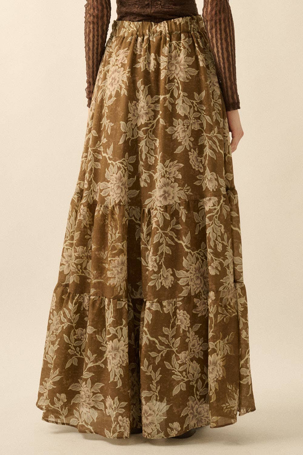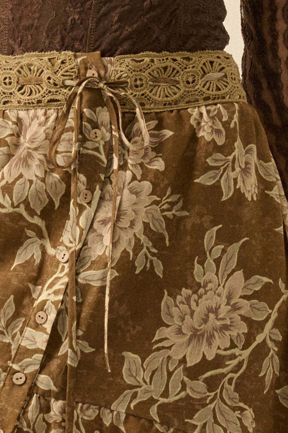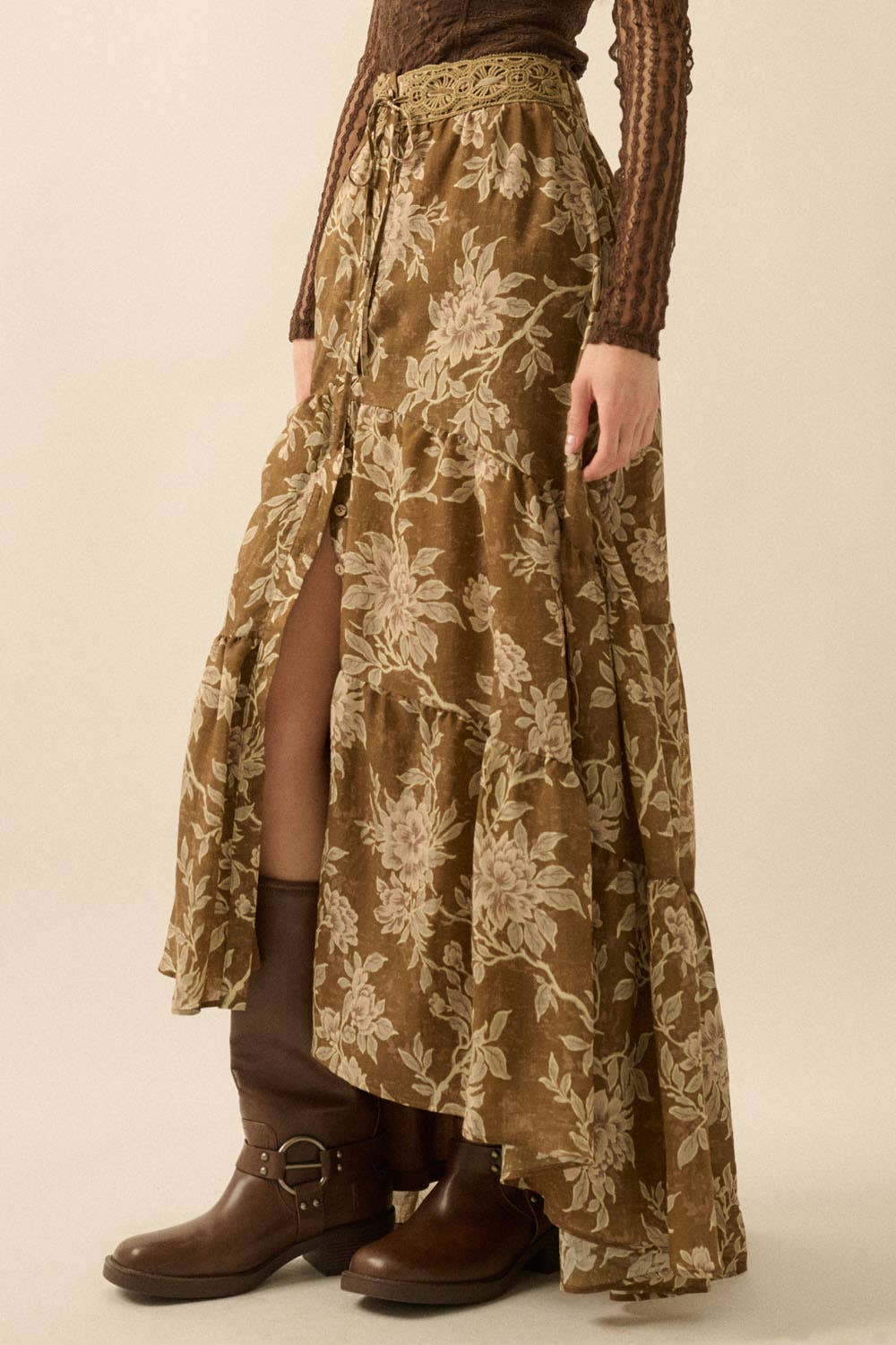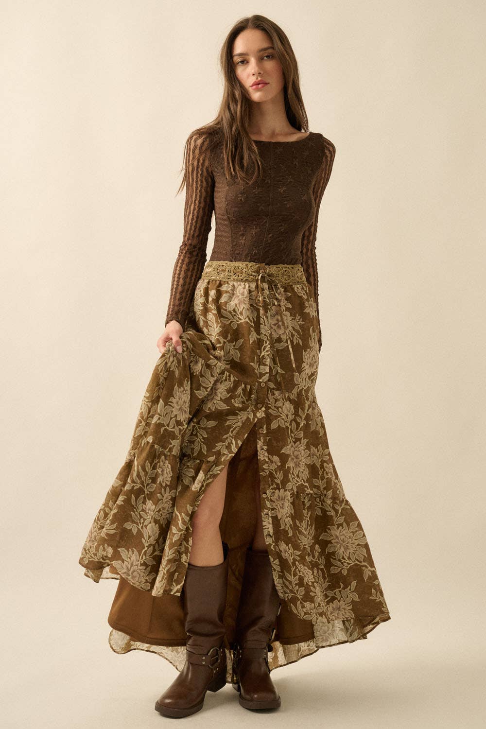 Elevate your wardrobe with the Evelin Skirt, featuring delicate floral lace and a tiered button-front design that radiates vintage charm. Its feminine silhouette and rustic details create a sophisticated look perfect for both casual days and special occasions. Comfortable and elegant, this maxi skirt is a timeless addition to any collection.