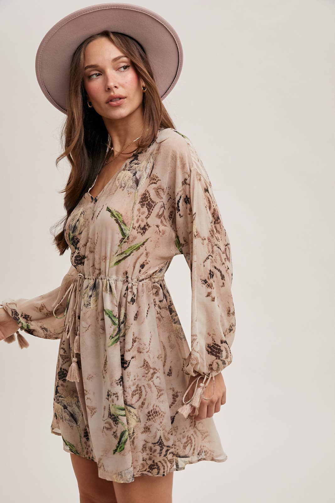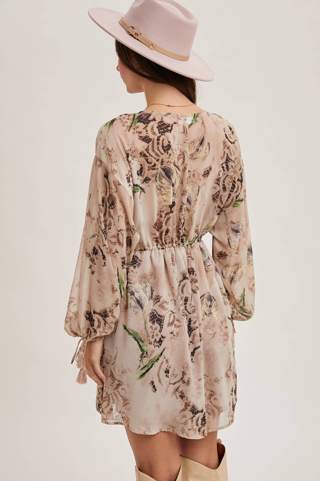 The Natalia Mini is an elegant mini dress featuring a delicate floral print and a drawstring waist for a tailored fit. Its V-neckline and voluminous bubble sleeves create a refined yet playful silhouette. This feminine piece effortlessly transitions from casual to semi-formal settings, with a youthful mini length that complements warm days or layering in cooler weather.
