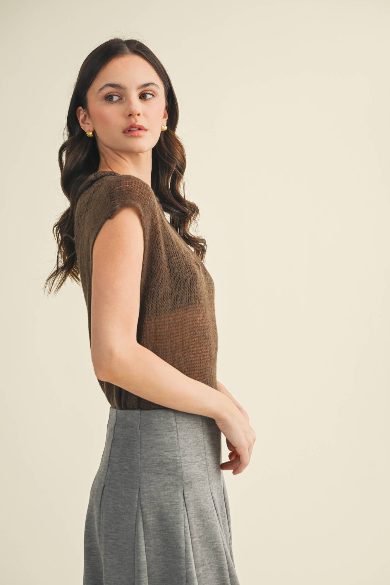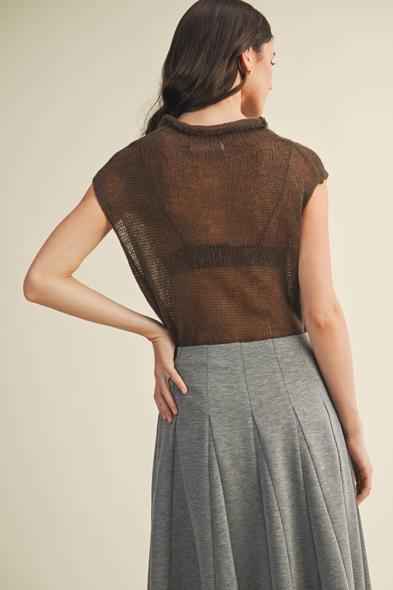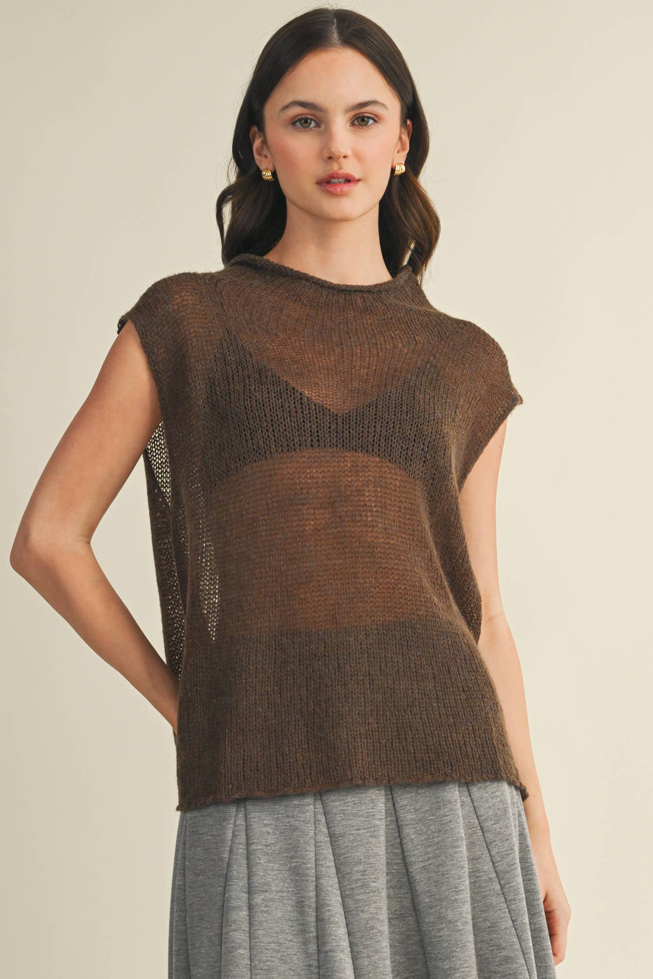 The Lia Top is a sleeveless sheer sweater with a high neck, blending edgy design with chic elegance. Its lightweight, transparent fabric creates a sophisticated look that’s perfect for layering or wearing on its own, offering a modern and refined style for any occasion.