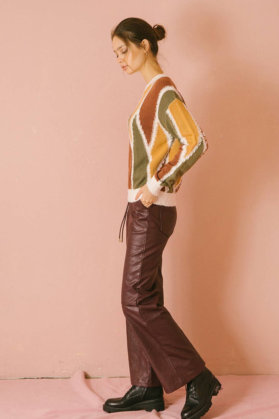 The Katy Sweater features a soft fuzzy neckline that adds a playful touch to its sophisticated design. Crafted with color-block knit patterns, this cute sweater brings a modern twist to your wardrobe while maintaining elegance. Perfect for those who want to combine fun and refinement effortlessly.
