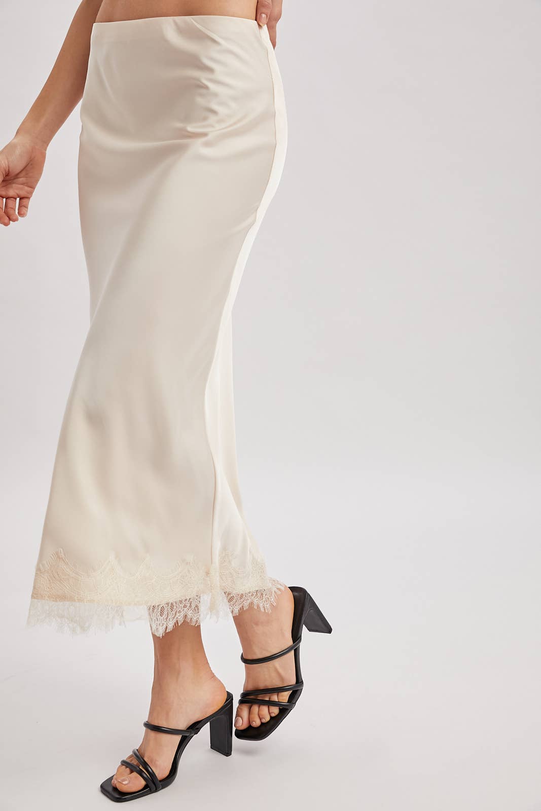 The Claire Midi effortlessly transitions from day to evening with its luxurious satin construction and graceful silhouette. Designed to skim your curves and flow toward the hem, this piece balances understated elegance with romantic detail. A stunning band of delicate scalloped eyelash lace adorns the bottom, creating an unexpected lingerie-inspired accent that elevates the entire look. The clean waistline keeps the focus on this exquisite embellishment, while the monochromatic palette ensures versatile styling. Perfect for those who appreciate sophisticated femininity with a touch of allure.